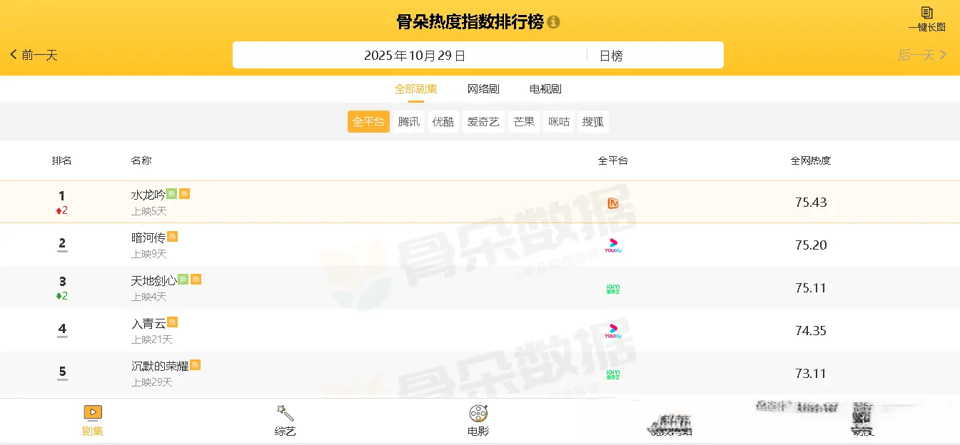 截止发文时间,从“骨朵热度指数排行榜”数据显示可知,当前热播电视剧中,全网热度最高的五部剧分别如下: